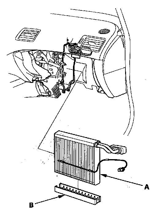 7. Carefully pull out the evaporator core (A) without bending the lines, then remove the plate (B).