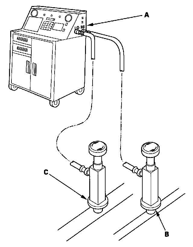 1. Connect an R-134a refrigerant recovery/recycling/charging station (A) to the high-pressure service port (B) and the low-pressure service port (C), as shown, following the equipment manufacturer's instructions.