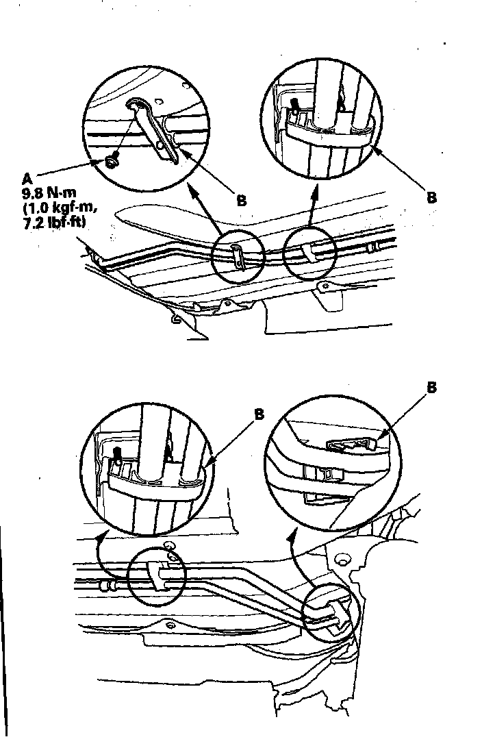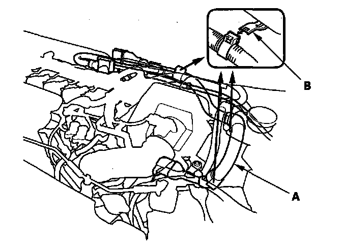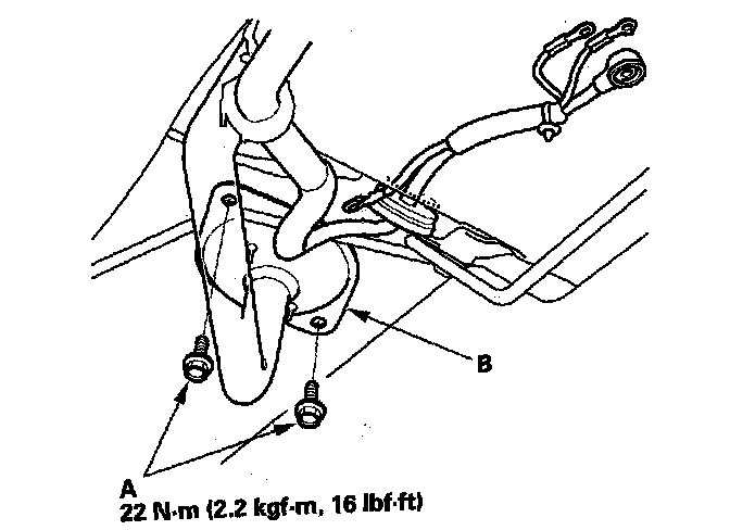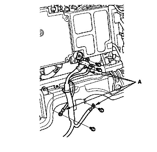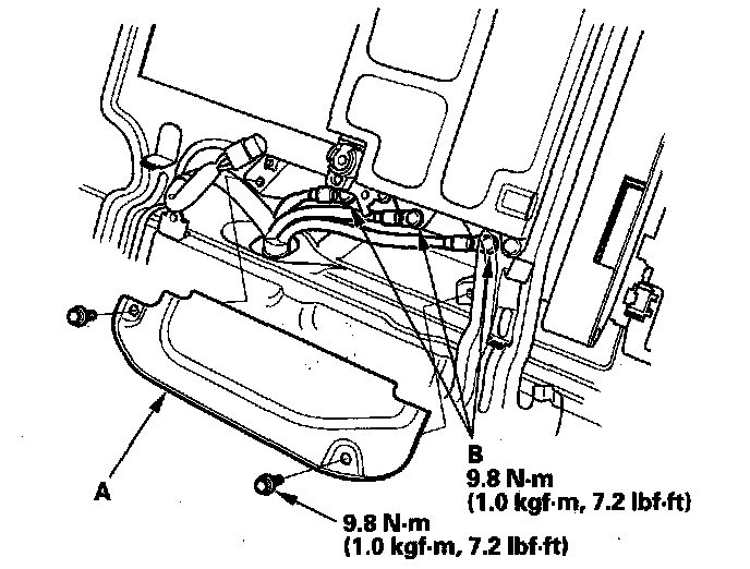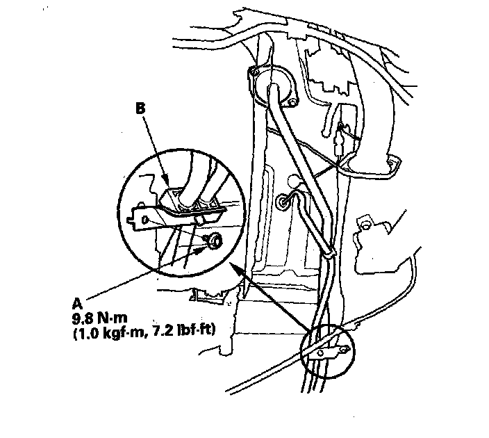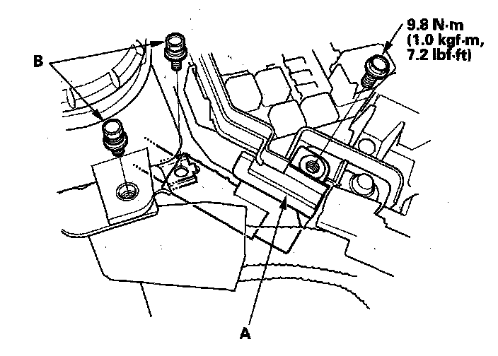 12. Remove the wire (A) from the under-hood fuse/relay box, then remove the bolts (B).