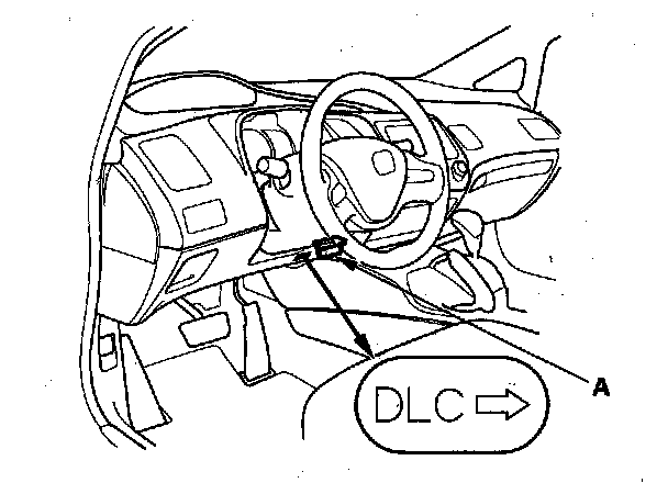 2. Connect the HDS or the Honda Interface Module; (HIM) to the data link connector (DLC) (A) located under the driver's side of dashboard.