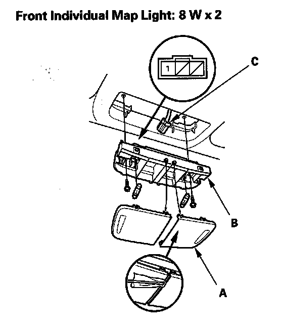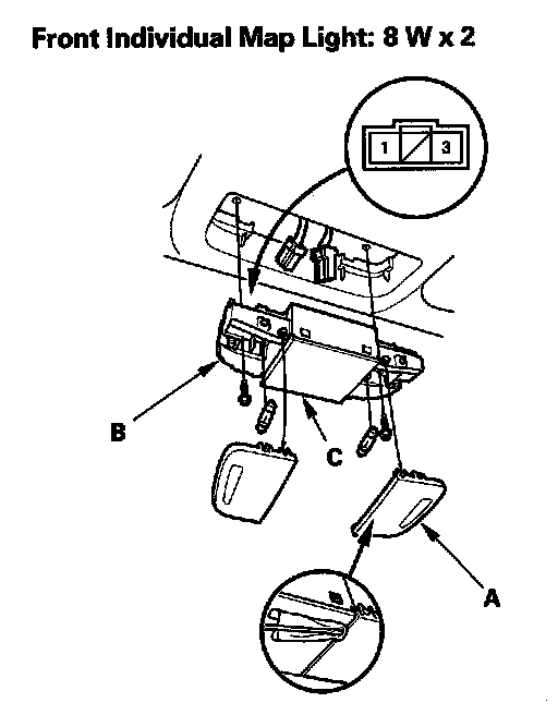 3. Remove the screws, then remove the map lights (B) and navigation microphone (C).