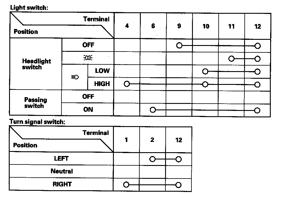 - If the terminals look OK, check for continuity between the terminals in each switch position according to the tables.
