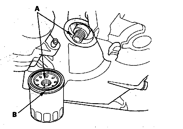 4. Inspect the threads (A) and the rubber seal (B) on the new filter. Wipe off the seat on the oil pan, then apply a light coat of new engine oil to the filter rubber seal. Use only filters with a built-in bypass system.