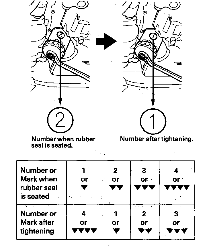 ^ Spin the filter on until its seal lightly seats against the oil pan, and note which number or mark is at the bottom.