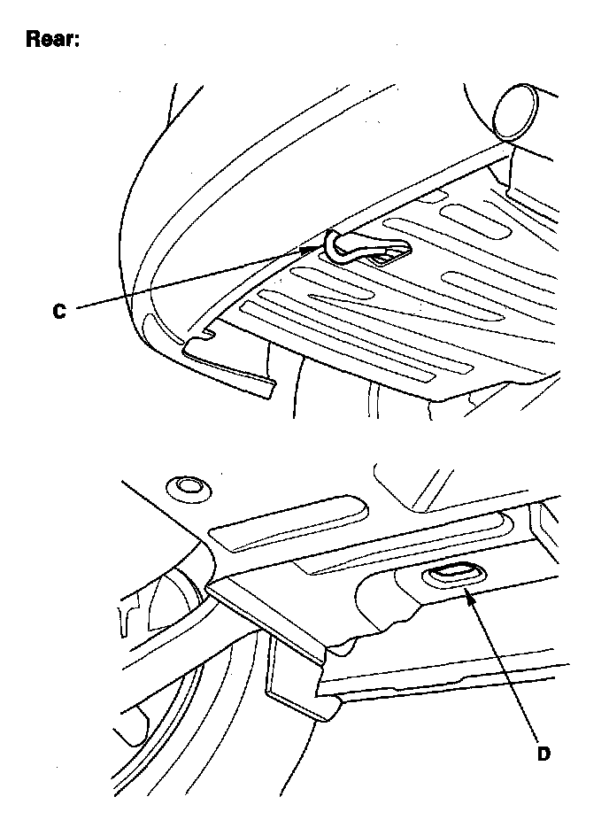 To accommodate flat-bed equipment, the vehicle is equipped with front towing hooks (A), front tie down hook slots (B), rear towing hook (C), and rear tie down hook slots (D).