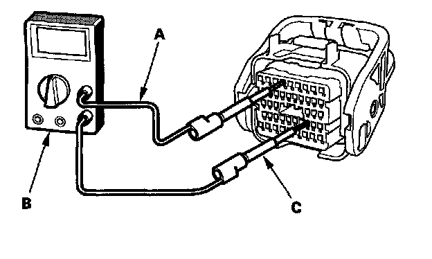 6. Connect one side of the patch cord (A) terminals to a commercially available digital multimeter (B), and connect the other side of the patch cord terminals to a commercially available banana jack (Pomona Electronics Tool No. 3563 or equivalent) (C).