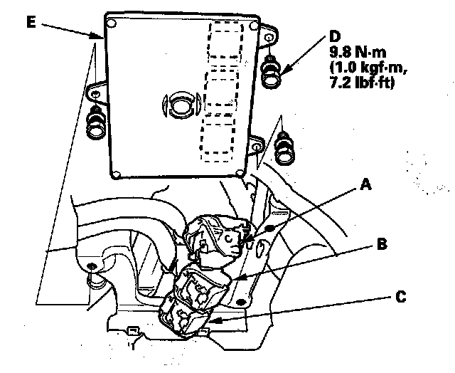 12. Remove the bolts (D), then remove the PCM (E).