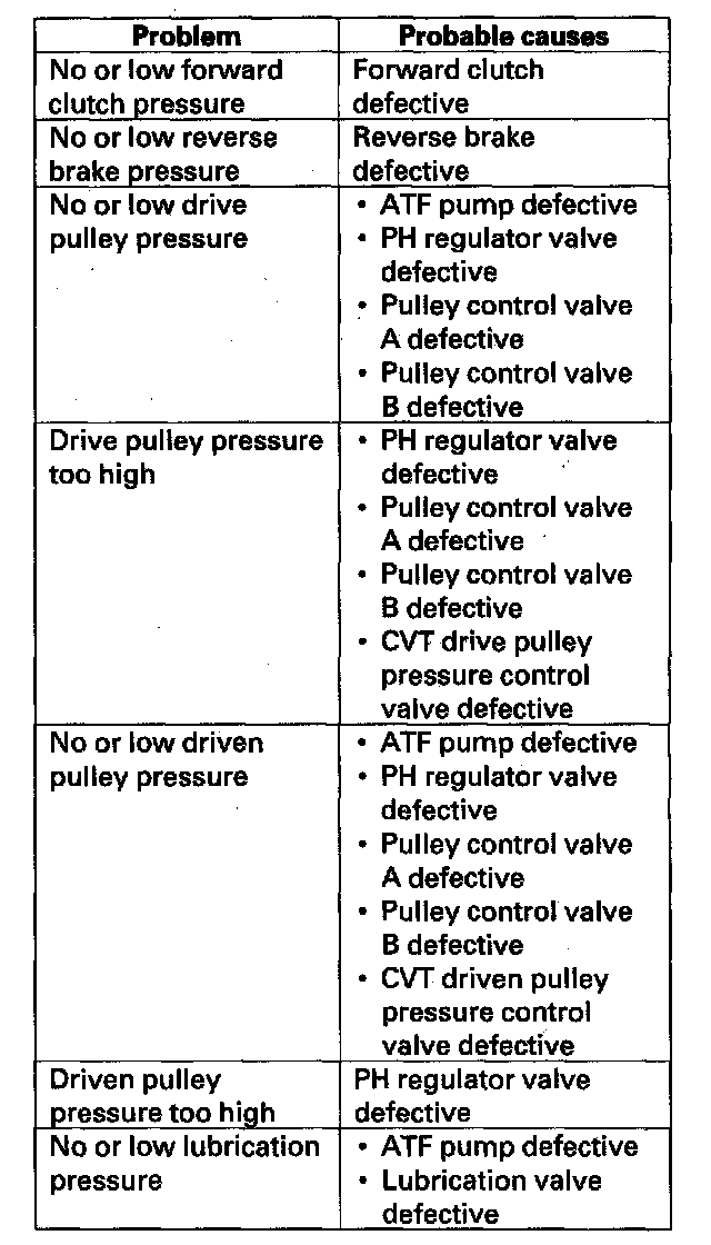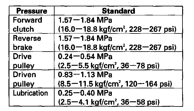 ^ Drive pulley pressure and driven pulley pressure may be above 3,430 kPa (35.0 kgf/cm2, 4,989 psi) when there is a transmission problem that causes the PCM to go into fail-safe mode.