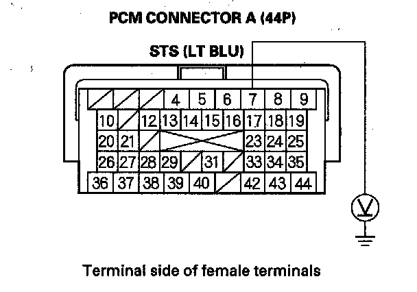 25. Measure the voltage between PCM connector terminal A7 and body ground with the ignition switch turned to START (III).