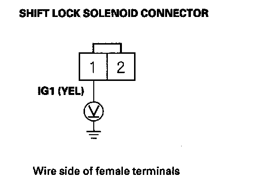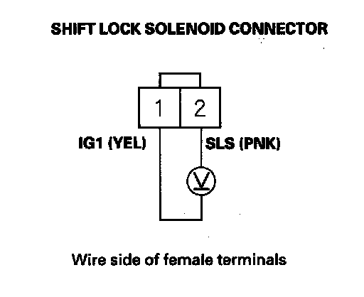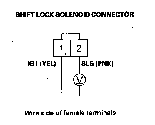 10. Release the brake pedal, and measure the voltage between shift lock solenoid connector terminals No. 1 and No. 2. The shift lever must be in P.