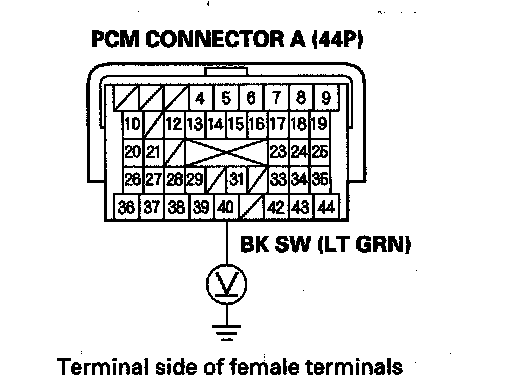 19. Measure the voltage between PCM connector terminal A40 and body ground while pressing the brake pedal and when the brake pedal is released.
