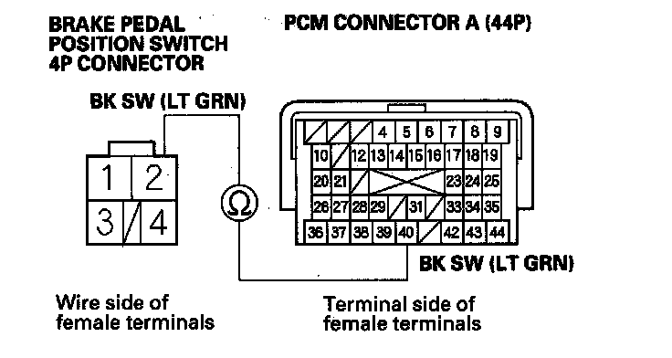 20. Check for continuity between PCM connector terminal A40 and brake pedal position switch 4P connector terminal No. 2.