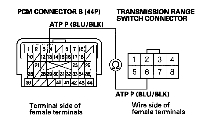 28. Check for continuity between PCM connector terminal B13 and transmission range switch connector terminal No. 6.