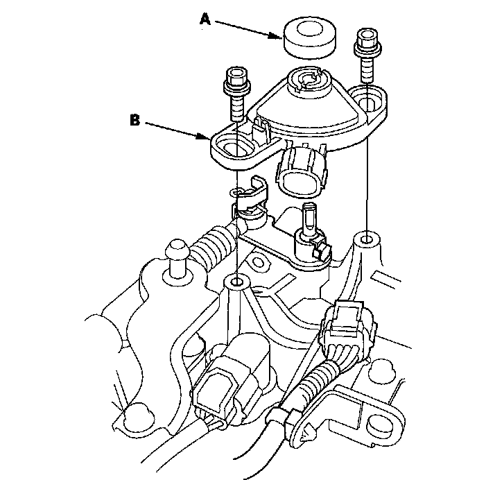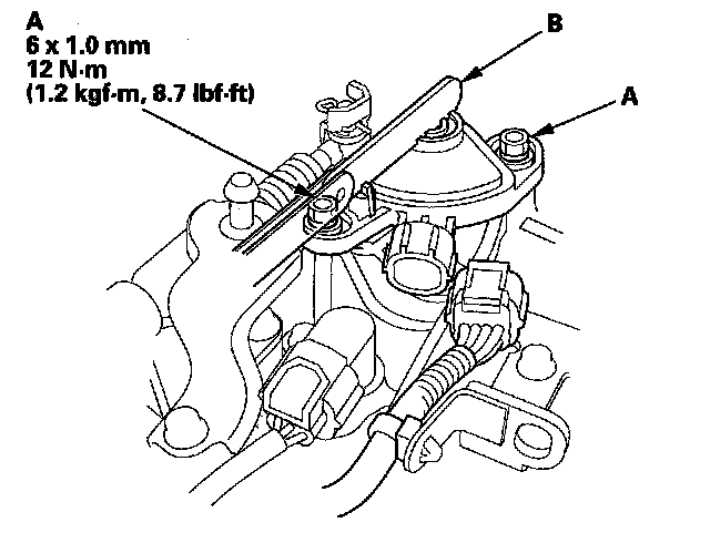 8. Tighten the bolts (A) on the transmission range switch while you continue to hold the N position. Do not move the transmission range switch when tightening the bolts. Remove the feeler gauge (B).