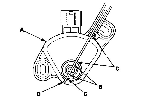6. To set up a new transmission range switch (A), align the cutouts (B) on the rotary-frame with the neutral positioning cutouts (C) on the transmission range switch. Then put a 2.0 mm (0.08 in.) feeler gauge blade (D) in the cutouts to hold the transmission range switch in the A/T position.