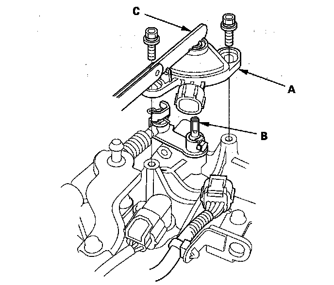 7. Install the transmission range switch (A) gently on the selector control shaft (B) while holding it in the N position with the 2.0 mm (0.08 in.) blade (C).