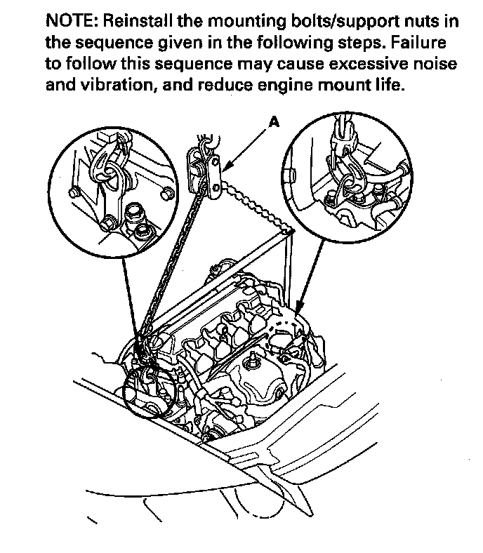 2. Position the engine/transmission under the vehicle. Be sure that they are properly aligned. Carefully lower the vehicle until the engine and transmission are properly positioned in the engine compartment. Make sure the vehicle is not resting on any part of the engine or transmission. Lift and support the engine with a chain hoist (A) and carefully raise the engine/transmission into place.