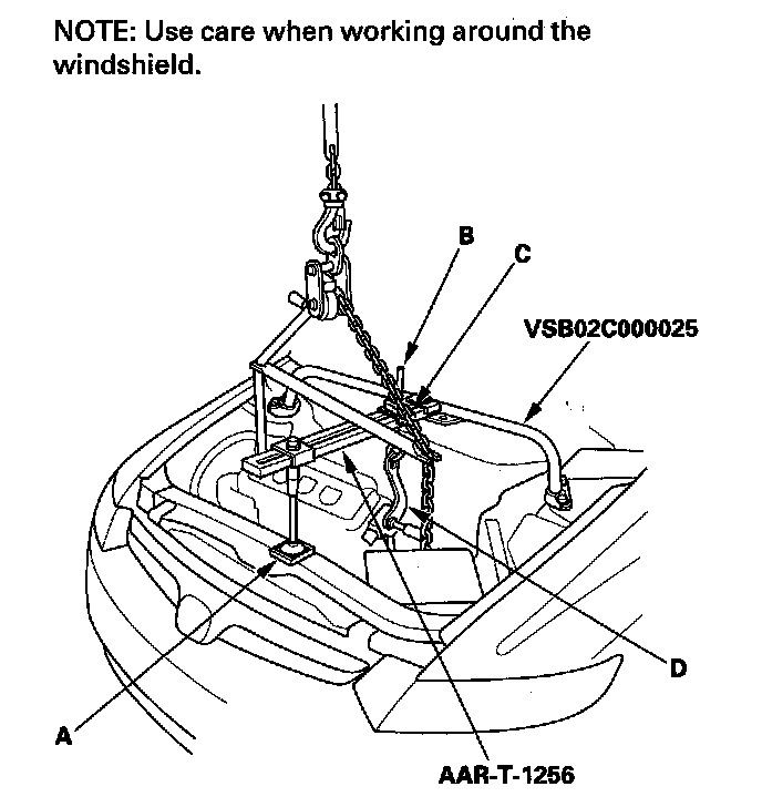 5. Install the front leg assembly (A), hook (B), and wing nut (C) from an A and Reds engine support hanger (AAR-T-1256) onto the 2006 civic engine hanger (VSB02CO00025). Carefully position the 2006 civic engine hanger on the vehicle, and attach the hook to the slotted hole in the support eyelet (D). Tighten the wing nut by hand to lift and support the engine/transmission.