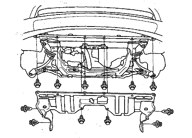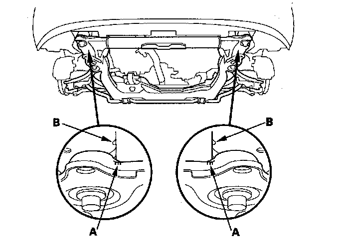 13. Align the front subframe reference marks (A) to the body (B), as noted during removal. Tighten the subframe mounting bolts to the specified torque.