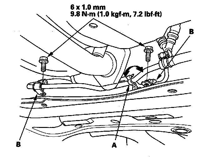 24. Install the power steering (P/S) line on the clamp (A), then install the P/S line brackets (B) on the subframe.