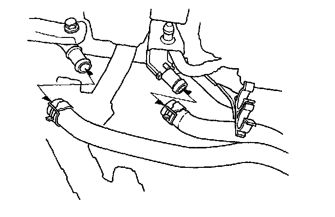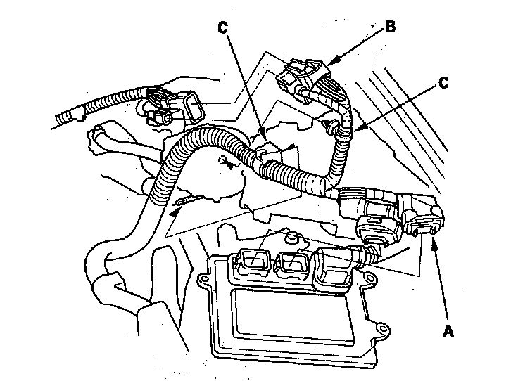 43. Install the vacuum hose (A), the brake booster vacuum hose (B), and the power steering (P/S) hose clamp (C).