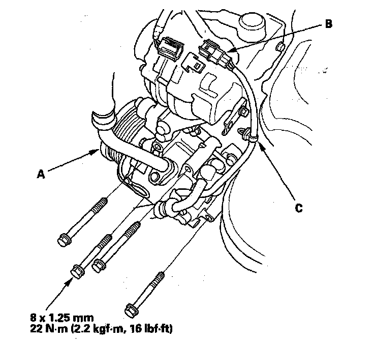 35. Connect the A/C compressor clutch connector (B), then install the harness clamp (C).
