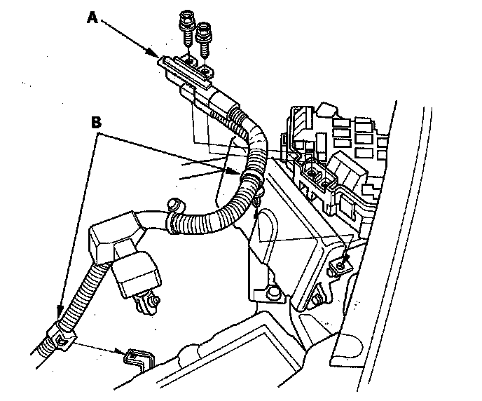 41. Install the battery cables (A) to the under-hood fuse/relay box.
