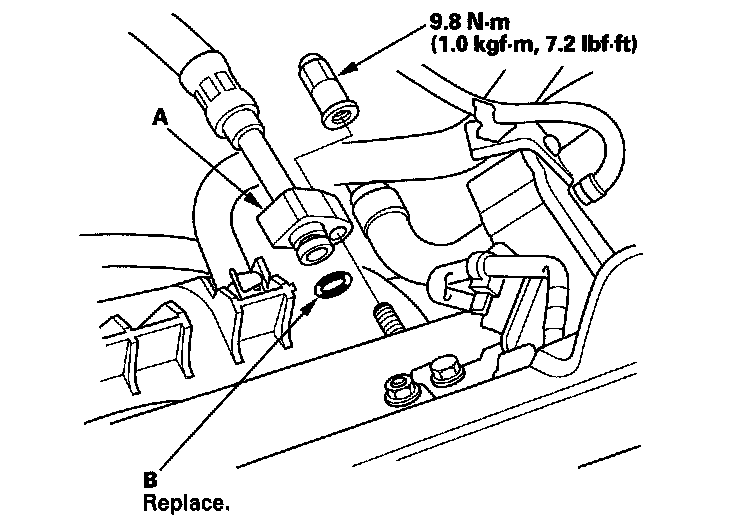 44. Install the fuel feed hose (A). Use new O-ring (B).