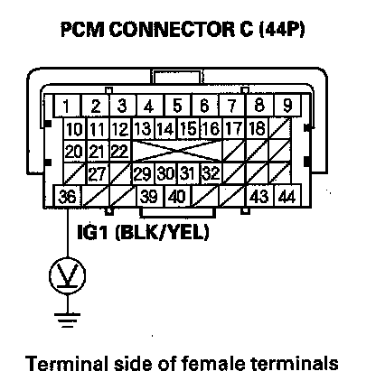 56. Measure voltage between PCM connector terminal C36 and body ground.