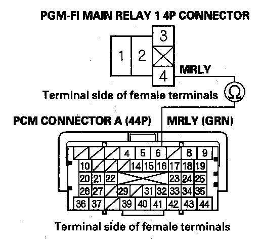 61. Check for continuity between PGM-FI main relay 1 4P connector terminal No.4 and PCM connector terminal A6.