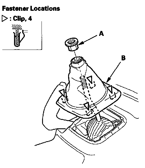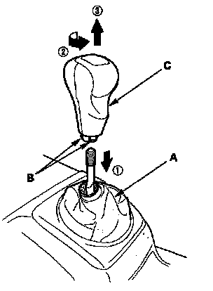 2. Standard M/T model: Lower the shift lever boot (A) to release the hooks (B) from the boot, then remove the shift knob (C).