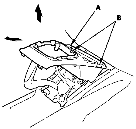 7. Pull the center console panel (A) up and rearward to release the tabs (B).