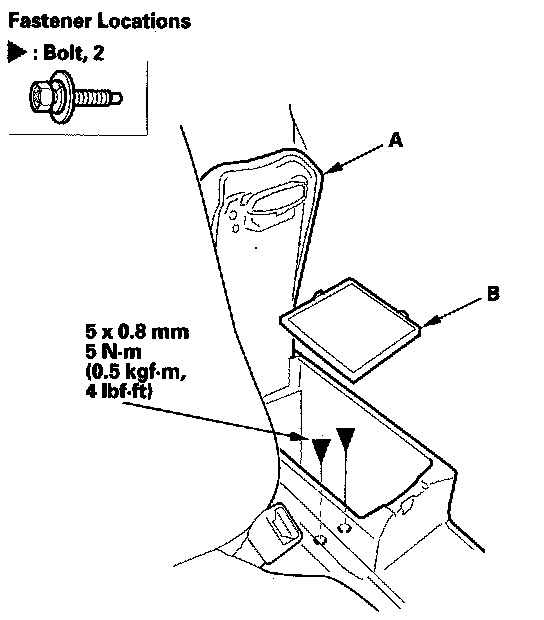 8. Open the armrest (A), then remove the console box mat (B) and bolts.