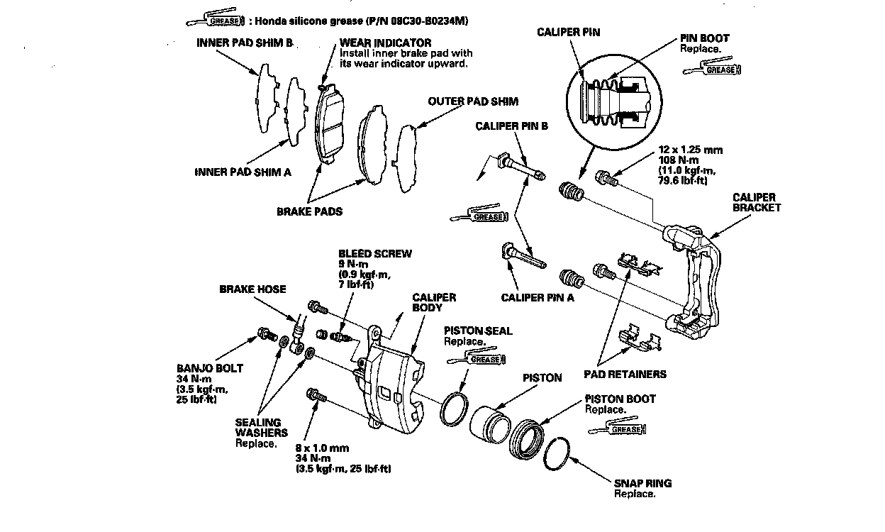 Front Brake Caliper OverhaulCAUTION: Frequent inhalation of brake pad dust, regardless of material composition, could be hazardous to your health.