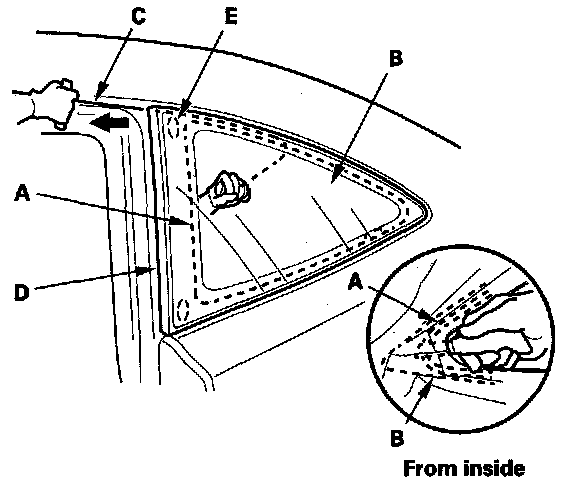 4. Carefully cut through the adhesive (A) at the rear corner portion of the quarter glass (B) with a utility knife. With a helper on the outside, pull the piano wire (C) back and forth in a sawing motion. Hold the piano wire as close to the quarter glass as possible to prevent damage to the body, and carefully cut through the adhesive around the entire quarter glass: