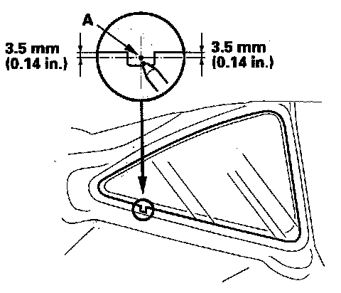 9. Set the quarter glass in the opening. Make an alignment mark (A) to the quarter glass with a grease pencil as shown where the clip will be installed.