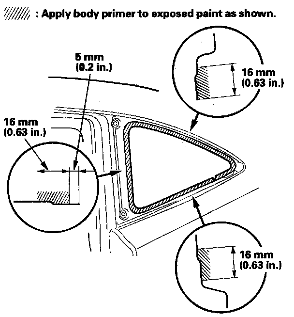 16. Carefully apply a light coat of body primer with a sponge to any exposed paint or metal around the flange where new adhesive will be applied. Let the primer dry for at least 10 minutes: