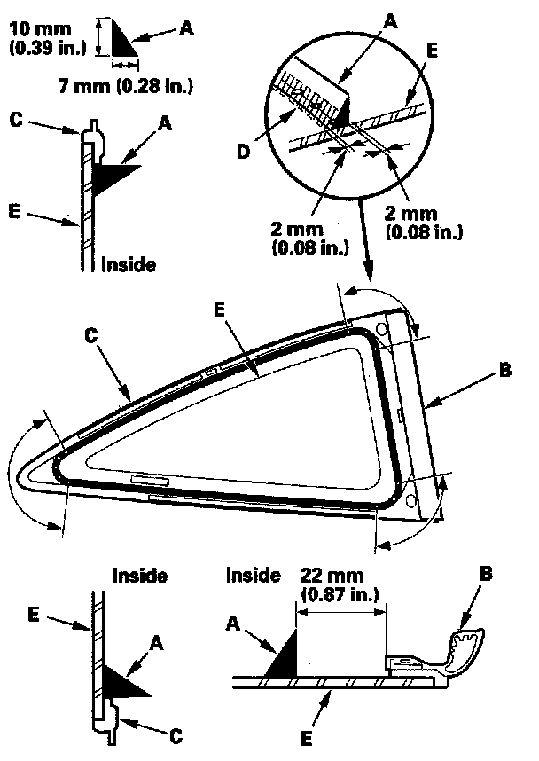 11. If the old quarter glass will be reinstalled (and either clip is broken off the molding), apply a light coat of primer, then apply butyl tape (A) to the molding (B) as shown. Attach the clip (C) with adhesive tape to the inside face of the quarter glass (D):