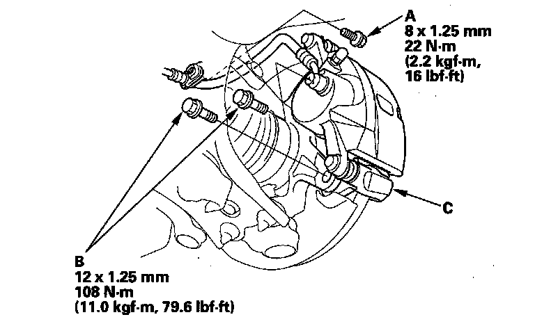 4. Remove the brake caliper bracket mounting bolts (B), then remove the caliper assembly (C) from the knuckle. To prevent damage to the caliper assembly or brake hose, use a short piece of wire to hang the caliper assembly from the undercarriage. Do not twist the brake hose excessively.