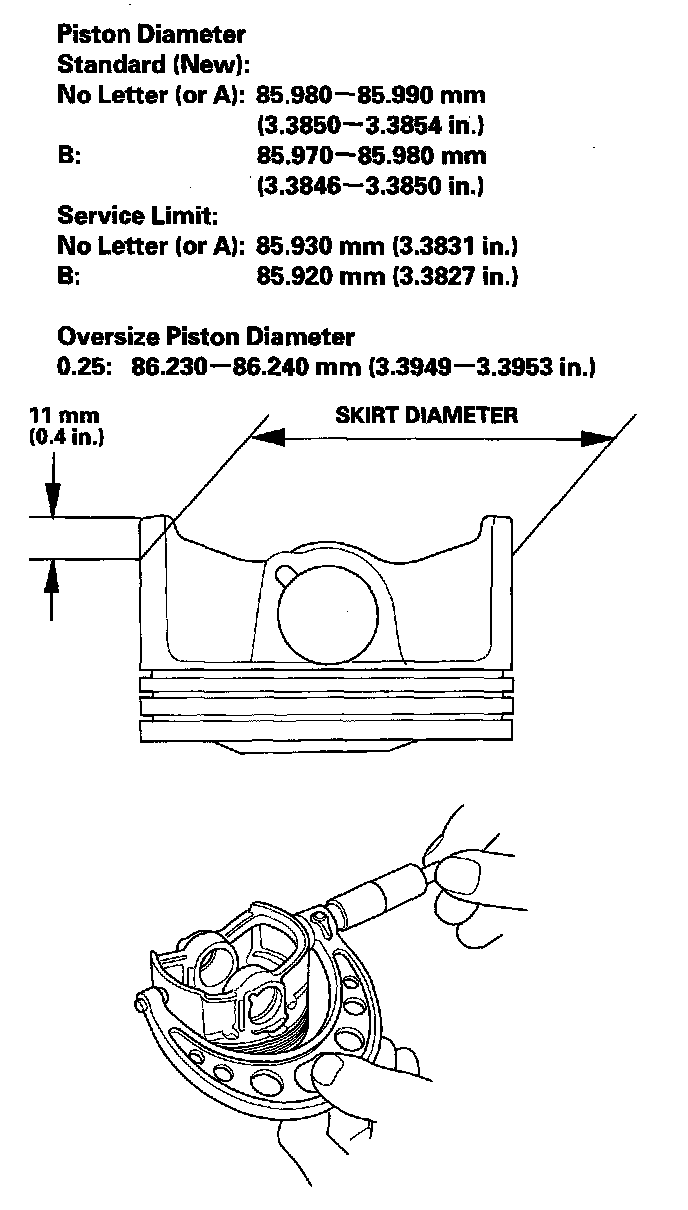 3. Measure the piston diameter at a point 11 mm (0.4 in.) from the bottom of the skirt. There are two standard-size pistons (No Letter or A, and B). The letter is stamped on the top of the piston. Letters are also stamped on the block as cylinder bore sizes.
