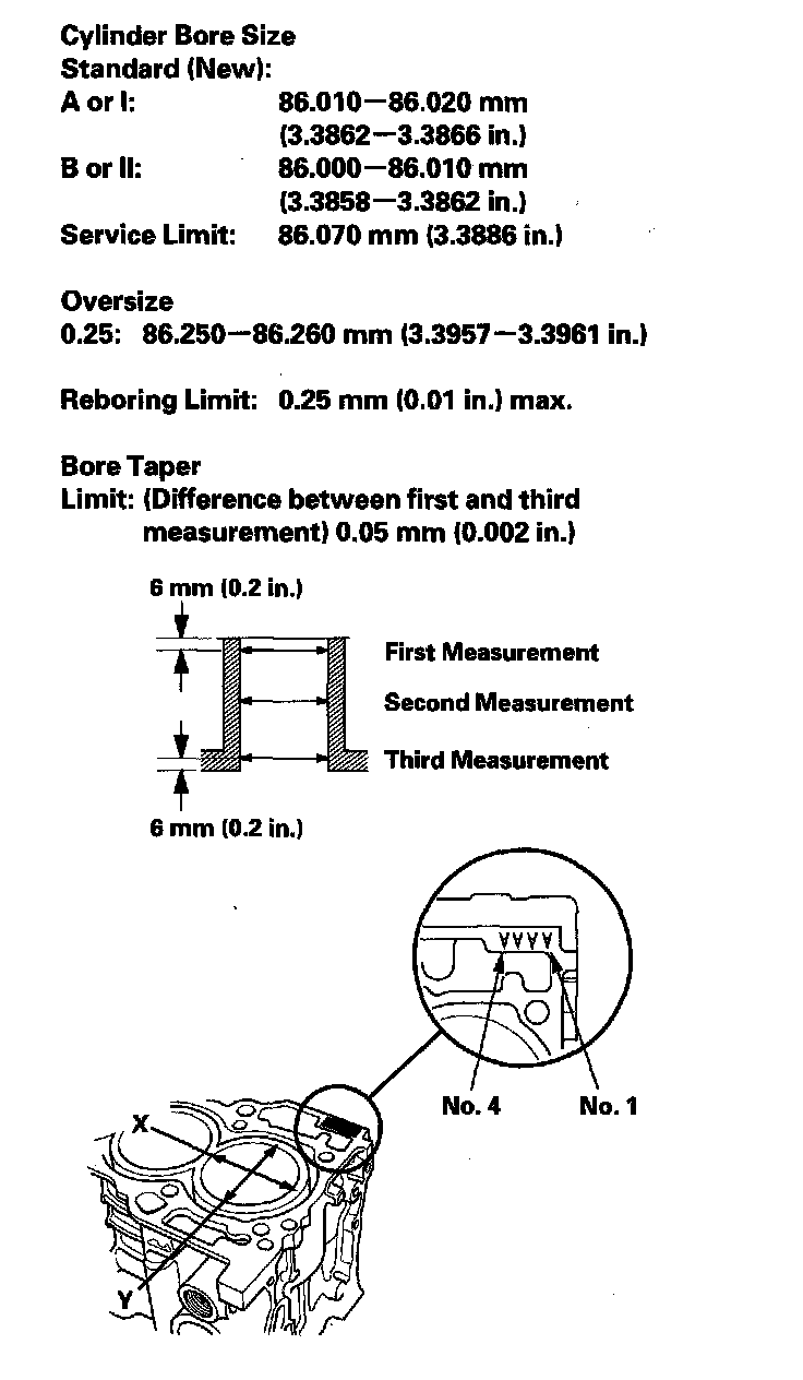 4. Measure the wear and taper in direction X and Y at three levels in each cylinder as shown. If the measurements in any cylinder are beyond the Oversize Bore Service Limit, replace the engine block. If the engine block is being rebored, refer to step 7 after reboring.