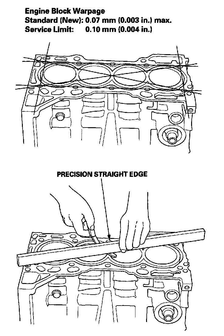 6. Check the top of the engine block for warpage. Measure along the edges, and across the center as shown.