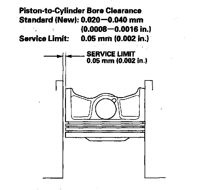 7. Calculate the difference between the cylinder bore diameter and the piston diameter. If the clearance is near or exceeds the service limit, inspect the piston and cylinder bore for excessive wear.