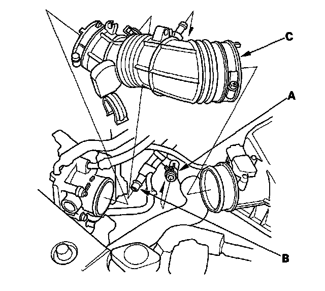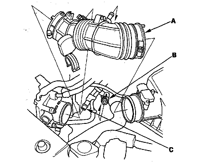 3. Disconnect the vacuum hose (A) and breather pipe (B), then remove the intake air duct (C).