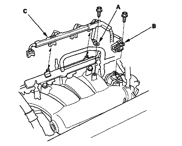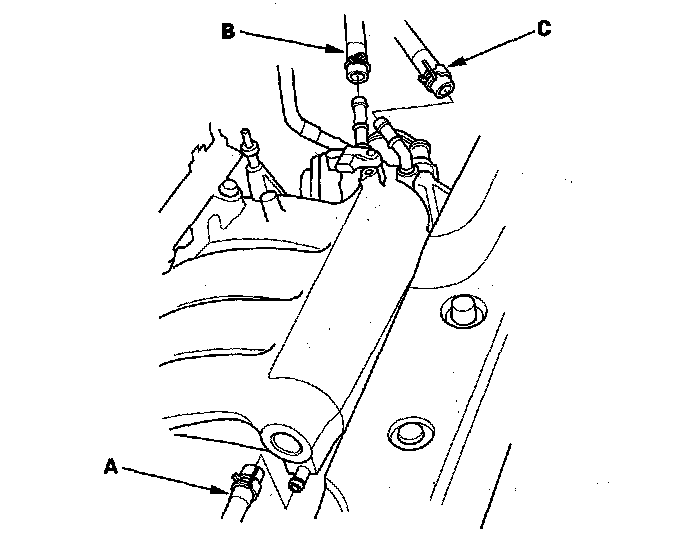 7. Install the positive crankcase ventilation (PCV) hose (A), evaporative emission (EVAP) canister hose (B) and brake booster vacuum hose (C).