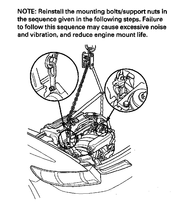 2. Raise the vehicle on the lift, and position the engine/transmission under the vehicle. Lower the vehicle, and attach the special tool and chain hoist to the engine, then lift the engine into position in the vehicle.