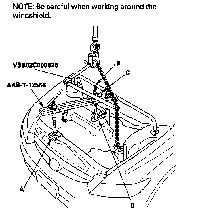 4. Install the front leg assembly (A), hook (B), and wing nut (C) from an A and Reds engine support hanger (AAR-T-12566) onto the 2006 civic engine hanger. Carefully position the engine hanger on the vehicle, and attach the hook to the forward hole in the engine hanger adapter (D). Tighten the wing nut by hand to lift and support the engine/transmission.