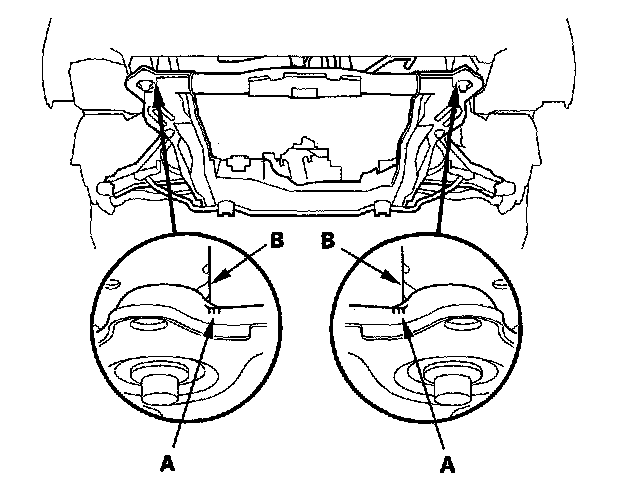 14. Align the front subframe reference marks (A) to the body (B), as noted during removal. Tighten the bolts on the front subframe to the specified torque.