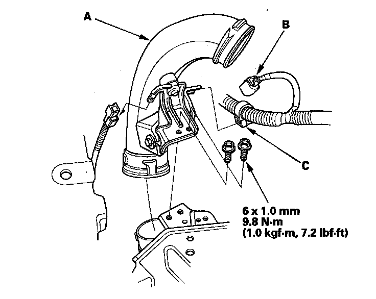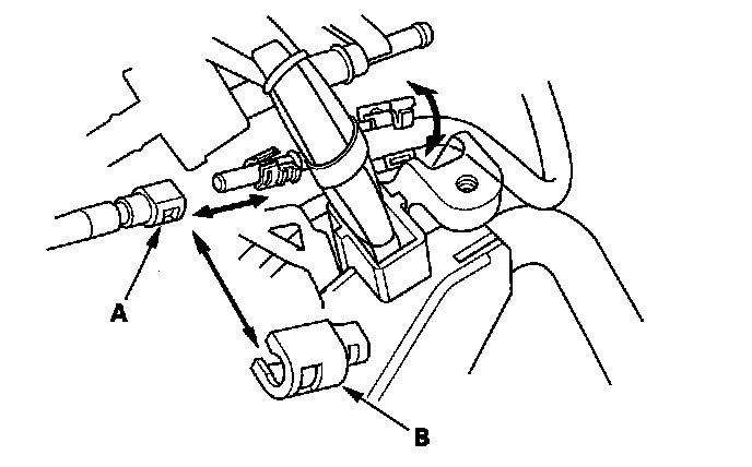 45. Install the evaporative emission (EVAP) canister hose (A) and brake booster vacuum hose (B).