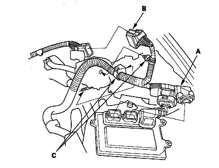 53. Connect the connector (B), and install the harness clamp (C).